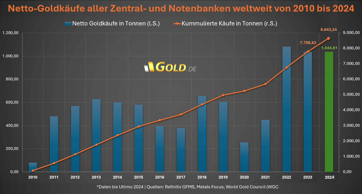 Seit 2010 wandelten sich die Zentral- und Notenbanken weltweit von Netto-Verkäufern zu Netto-Käufern. Im Jahr 2024 erwarben sie nahezu ein Viertel des globalen Goldangebots, insgesamt 694 Tonnen bis Ende September 2024. Dieser Trend unterstreicht die strategische Bedeutung von Gold als globaler Reservewährung und Inflationsschutz.