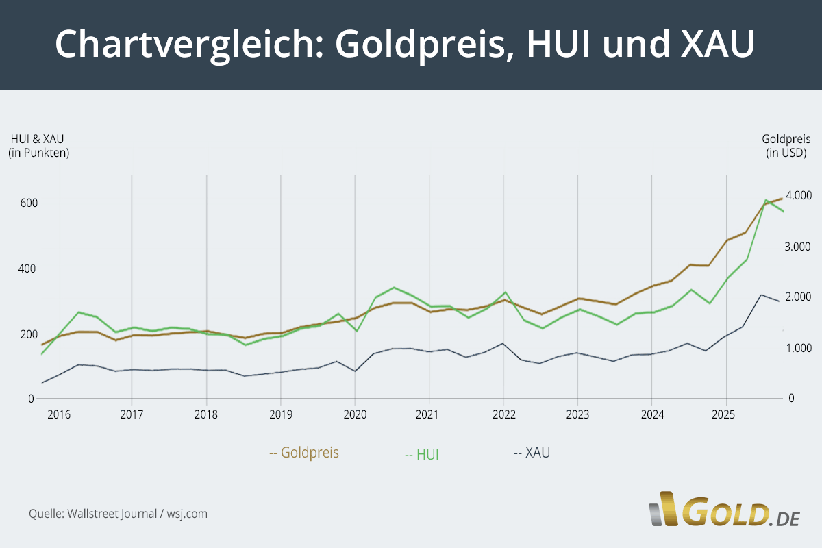 Hinweis: Der NYSE Arca Gold BUGS Index (HUI) umfasst hauptsächlich Goldminenunternehmen, die ihre Produktion nicht langfristig absichern, während der Philadelphia Gold and Silver Index (XAU) sowohl Gold- als auch Silberproduzenten einschließt. Beide Indizes bieten Anlegern die Möglichkeit, über entsprechende ETFs breit diversifiziert in den Edelmetallsektor zu investieren.